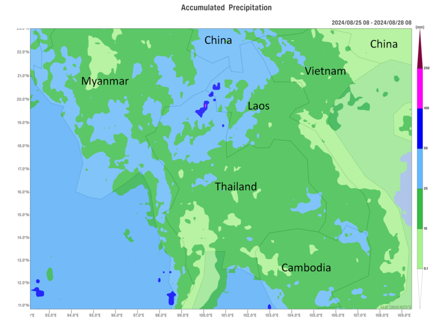 During the past week (August 18-24th), under the influence of the monsoon trough, continuous heavy rainfall occurred in northern Thailand with accumulated rainfall reaching 50-200mm, and locally approaching 300mm; it is expected that during the next three days (August 25-27th), moderate to heavy rain will heppen in the central and northern parts of Thailand, with heavy rain in some parts of the north, and locally severe heavy rain. Local flooding will maybe occur in these areas due to the intense precipitation, with high risk of flash floods and geological disasters in some parts of northwestern Thailand (yellow alert).