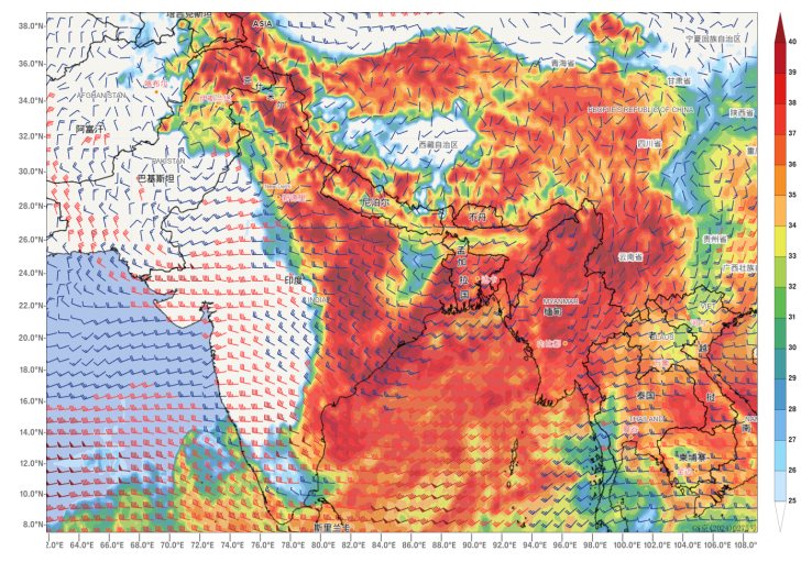 Figure 1 Forecast of 850 hPa Wind Field (wind barbs, unit: m/s) and K-Index (shaded, unit: °C) at 08:00 BST on May 31, 2025