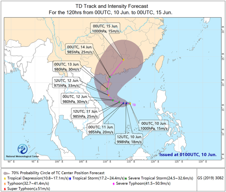 A tropical depression formed in the central South China Sea on the morning of June 10th. At 8:00 AM (BJT), its center was located approximately 285 kilometers southeast of Sansha City, Hainan Province, China (near 15.8°N, 114.8°E), with the maximum wind speed near the center reaching 7 levels (15 m/s) and the minimum central pressure at 1000 hPa (Fig.1). It is expected that this depression will move westward at a speed of 10 kilometers per hour, gradually intensifying and potentially developing into a typhoon within 24 hours. It will approach the coastal areas from southern Hainan Island to western Guangdong Province, China, and is likely to make landfall around June 13th as a severe tropical storm to typhoon (10-12 levels, 25-33 m/s). After landfall, its intensity is expected to gradually weaken.