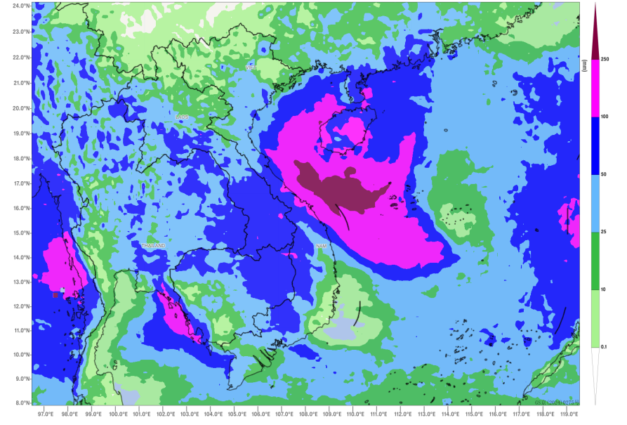 Affected by this weather system, it is expected that from June 11 to 13, parts of central and southern Vietnam, as well as the northeastern regions, will experience moderate to heavy rainfall. Specifically, localized heavy downpours are anticipated in areas including Ha Tinh Province, Quang Binh Province, Quang Tri Province, and Quang Nam Province. The cumulative precipitation in most of these regions is forecasted to be between 30-45 mm, with some areas receiving 60-80 mm, and locally exceeding 110 mm (Fig.2). Additionally, from June 12 to 14, the Beibu Gulf and the northern coastal areas of Vietnam will experience strong winds of 8 to 9 on the Beaufort scale, with gusts reaching 10 to 11. Attention should be given to the potential for localized flooding or landslides triggered by the heavy rainfall.