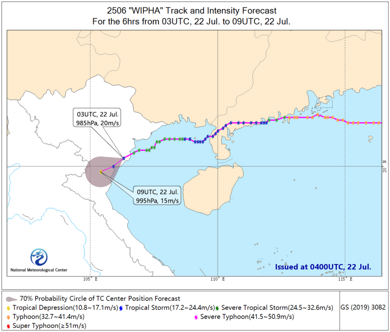 Typhoon Wipha (The 6th typhoon of this year) made its second landfall along the coast of Thai Binh Province, Vietnam, around 9:30 AM (BJT, hereafter) today (July 22). After making landfall, it weakened to a tropical storm, with maximum sustained winds near the center reaching 9 levels (23 meters per second) and the minimum central pressure at 980 hPa. Affected by the typhoon, on July 21, northern Vietnam experienced heavy to torrential rain, with localized extremely heavy downpours (Figure 2).