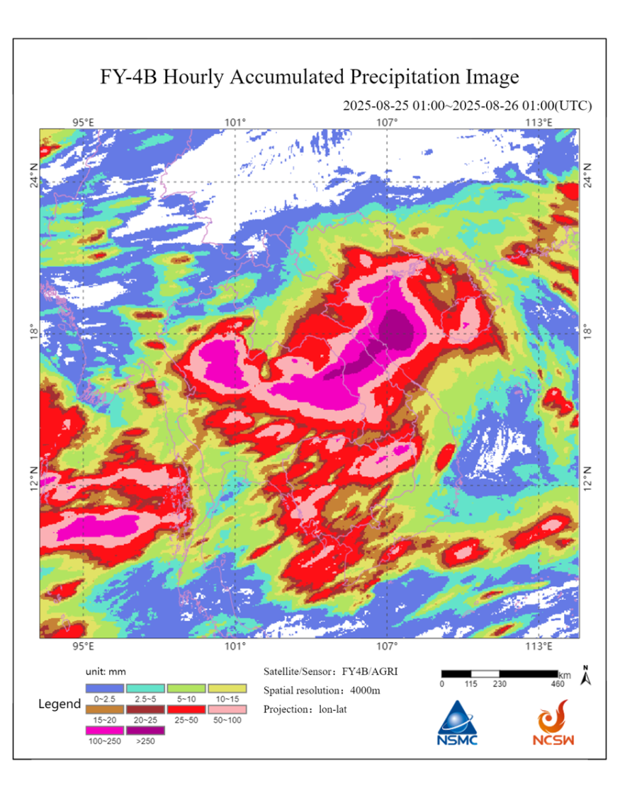 At 10:00 AM on the 26th, the center of Typhoon "Kajiki" is located within the Xiangkhouang Province of Laos (Figure 2). It is expected to move northwestward at a speed of approximately 25 kilometers per hour, with its intensity continuing to weaken (Figure 3). From August 26 to 27, affected by Typhoon "Kajiki" and its remnants (Figure 4), heavy to very heavy rainfall is anticipated in parts of central and northern Vietnam, northern Laos, northern Thailand, and central and eastern Myanmar. Most of these areas are expected to receive cumulative rainfall of 60-100 mm, with some regions experiencing 120-160 mm, and localized areas exceeding 200 mm (approaching or surpassing historical extreme values for the same period).