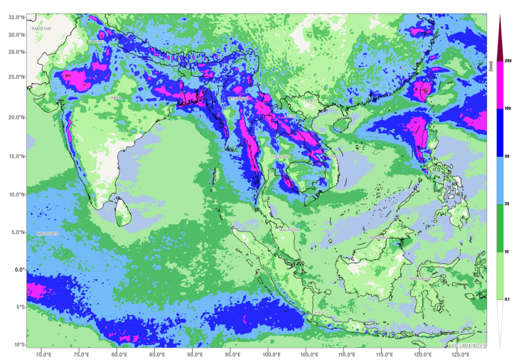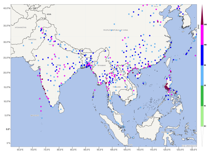 Over the past week, torrential rain to downpours has affected parts of India, Bangladesh, Thailand, southern Myanmar, western Laos, northern Vietnam, and the Philippines, with extremely heavy rain occurring locally. Accumulated rainfall reached 80-120 mm widely across these regions, 140-200 mm in some areas, and over 350 mm at specific locations(Figure 1).