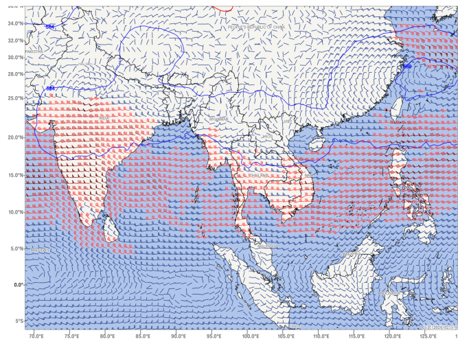 It is forecasted that from July 27 to 30, influenced by the southwest monsoon (Figure 2), heavy to torrential rain will occur in western and northern India, Nepal, Bangladesh, Myanmar, northern Thailand, central Laos, central Vietnam, and northwestern Philippines, with localized extremely heavy downpours. These rains will be accompanied by severe convective weather such as short-duration intense rainfall and thunderstorms with strong winds. The cumulative precipitation in most of these areas is expected to range from 60-100 mm, with some regions receiving 120-180 mm. Localized areas in southern Rajasthan and southeastern West Bengal in India, southeastern Shan State and southeastern Bago Region in Myanmar could see accumulations exceeding 250 mm(Figure 3).