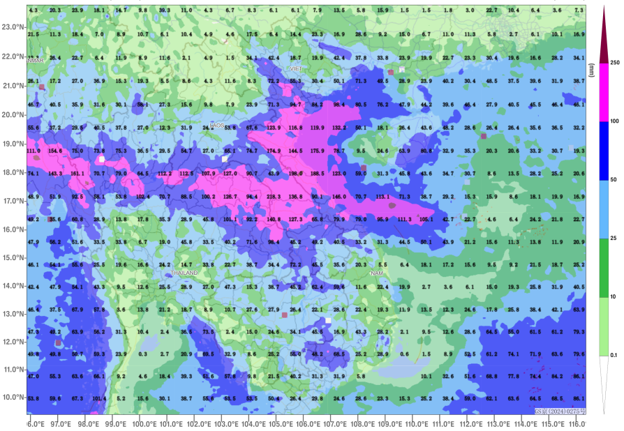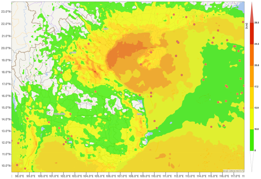 Affected by a tropical depression (Figure 1), heavy to very heavy rainfall is expected in central and northern Vietnam from August 29 to 31. Specifically, localized downpours or intense rain are anticipated in areas including Yen Bai, Phu Tho, Hoa Binh, Ha Tay, Ha Nam, Nam Dinh, Ninh Binh, Thanh Hoa, Nghe An, Ha Tinh, and Quang Binh provinces. Accumulated precipitation in most of these regions is forecasted to be between 50 and 90 mm, with some areas receiving 100 to 150 mm, and locally exceeding 260 mm in central Vietnam (Figure 2). The eastern coastal areas of Vietnam will experience strong winds of 7-8 gales, with gusts reaching 9-10 (Figure 3). Additionally, heavy to very heavy rain is also expected in central and southern Laos, northern Thailand, and southern Myanmar, with localized intense downpours.