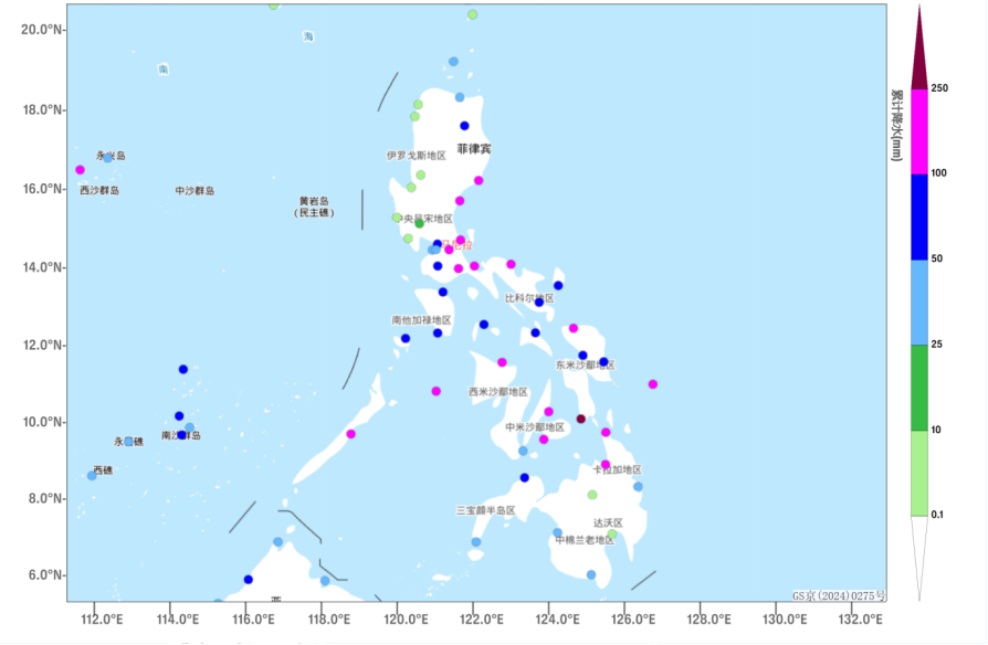 图 1 11月2 -5日08时菲律宾累计降水量实况(单位。m/s) 图 4 11月6日08时-10日08时累计降水量预报(单位。mm) 图2 台风。上述大部地区累计降水量达30~60毫米