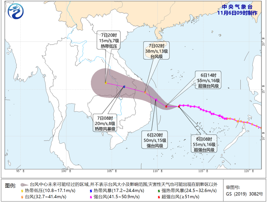 6日10时,“海鸥”(超强台风级)中心位于越南嘉莱省归仁市东偏南方向约295公里的南海西南部海面,预计将以每小时20-25公里的速度向西偏北方向移动,今天白天强度维持,晚上开始逐渐减弱,将于夜间在越南中部一带沿海登陆(40-45米/秒,13-14级,台风级或强台风级),之后强度迅速减弱(图2)。