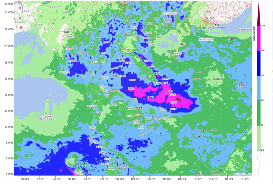 预计,6日至9日台风“海鸥”及其残涡将影响中南半岛中东部地区,其中越南、马来半岛、老挝南部、柬埔寨中北部、泰国中北部、缅甸东南部先后有中到大雨,部分地区暴雨或大暴雨,沿海地区还伴有大风(6~8级大风、阵风9~10级)(图3);上述大部地区累计降水量达30~60毫米,部分地区80~120毫米,局地超过180毫米(越南昆嵩省和嘉莱省交界处)(图4)。需关注较强风雨对电力设施、交通运输等行业的不利影响以及局地强降雨可能引发的洪涝、山体滑坡、泥石流和城市内涝等次生灾害。