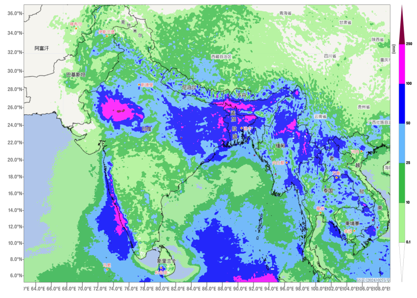 预计未来三天,受西南季风和印度低压共同影响(图1),印度北部和西南部、孟加拉国、缅甸北部、巴基斯坦东北部等地部分地区有大到暴雨,局地有大暴雨,并伴有短时强降水、雷暴大风等强对流天气;上述大部地区累计降水量有50~90毫米,部分地区100~140毫米,其中,印度拉贾斯坦邦局地可达250毫米以上(图2)。