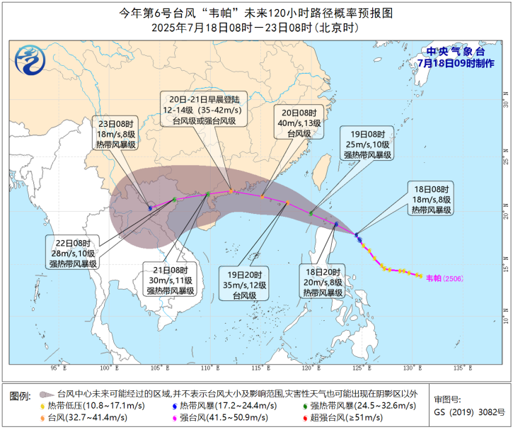 图1 台风路径概率预报图(北京时间2025年7月18日08时–23日08时)