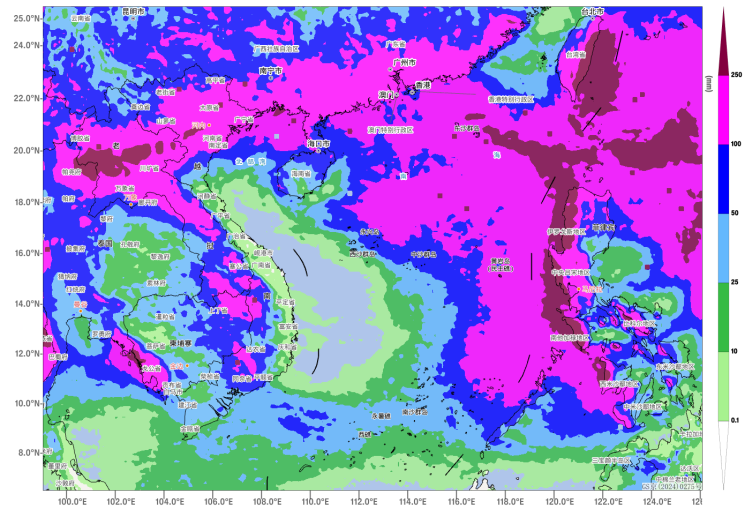 图2 2025年7月18–23日菲律宾等地累计降水量预报(单位:mm)