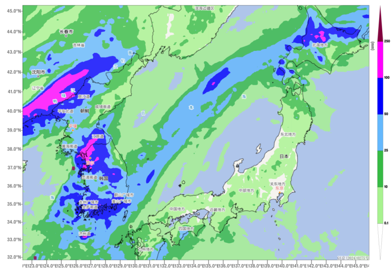图4 2025年7月18–21日朝鲜半岛等地累计降水量预报(单位:mm)