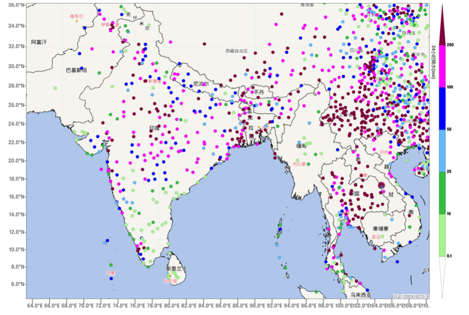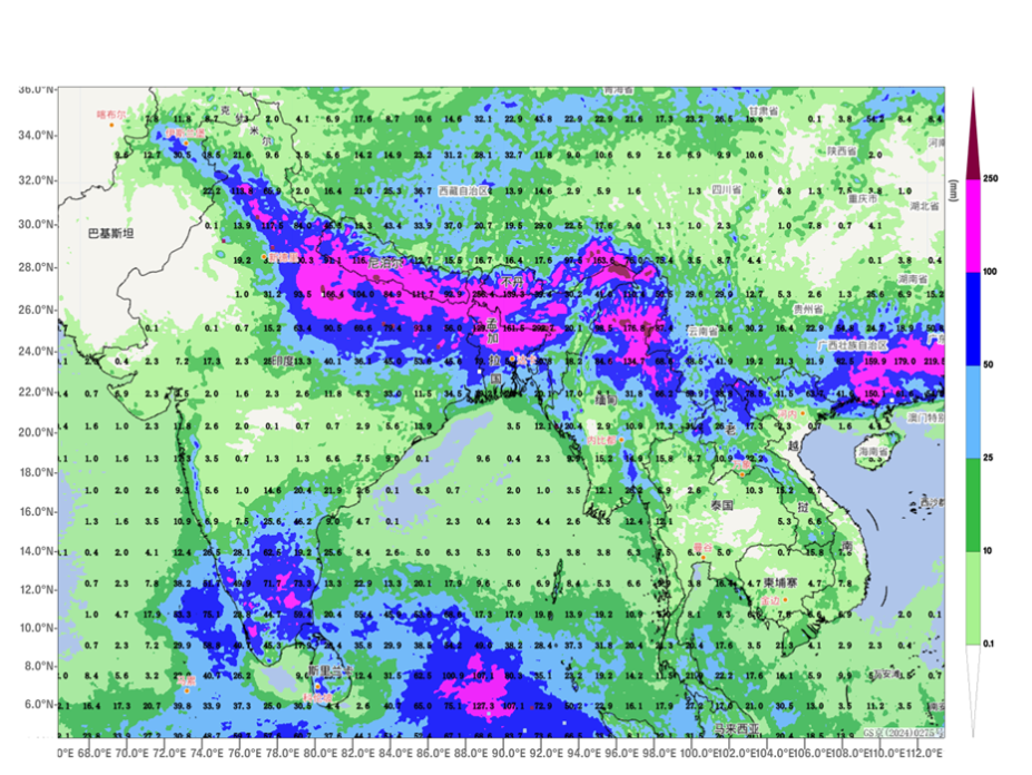 预计8月2–5日,受低涡和西南季风共同影响(图2),印度北部、尼泊尔、不丹、孟加拉国北部、缅甸北部、泰国北部、老挝北部等地将出现大到暴雨,局地大暴雨,并伴有短时强降水、雷暴大风等强对流天气;上述大部地区累计降水量在60~110毫米,部分地区150~220毫米,局地可达250毫米以上(图3)。