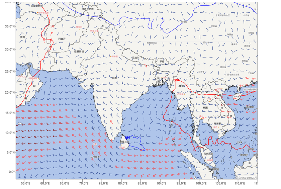 图2 2025年8月3日00时(UTC)500hPa位势高度(等值线)和850hPa风场(风羽)