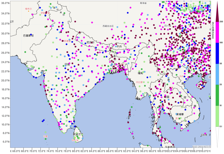 过去一周,印度、孟加拉国、尼泊尔、不丹、泰国、老挝、越南南部等地部分地区出现暴雨或大暴雨,局地出现特大暴雨,上述地区过程累积雨量普遍达80~150毫米,部分地区150~300毫米,局地超过400毫米(图1)。