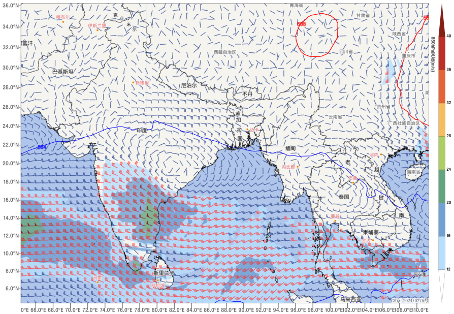 图2 2025年8月16日00时(UTC)500hPa位势高度(等值线)和850hPa风场(风羽)