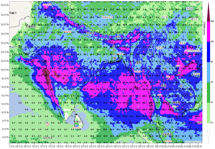 预计8月15–20日,受低涡和西南季风共同影响(图2),印度中北部和西部、不丹、尼泊尔、缅甸、泰国、老挝、越南、柬埔寨、菲律宾、马来西亚、印度尼西亚等地部分地区有中到大雨,局地暴雨或大暴雨,并伴有短时强降水、雷暴大风等强对流天气;上述大部地区累计降水量在60~150毫米,部分地区180~300毫米,局地可达400毫米以上,其中,印度中部降水量可达到或超过历史同期极值(图3)。