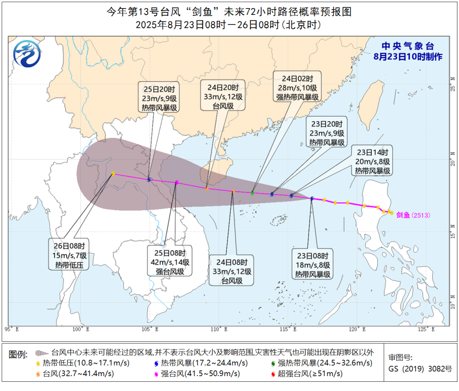 图1 台风路径概率预报图(北京时间2025年8月23日08时–26日08时)