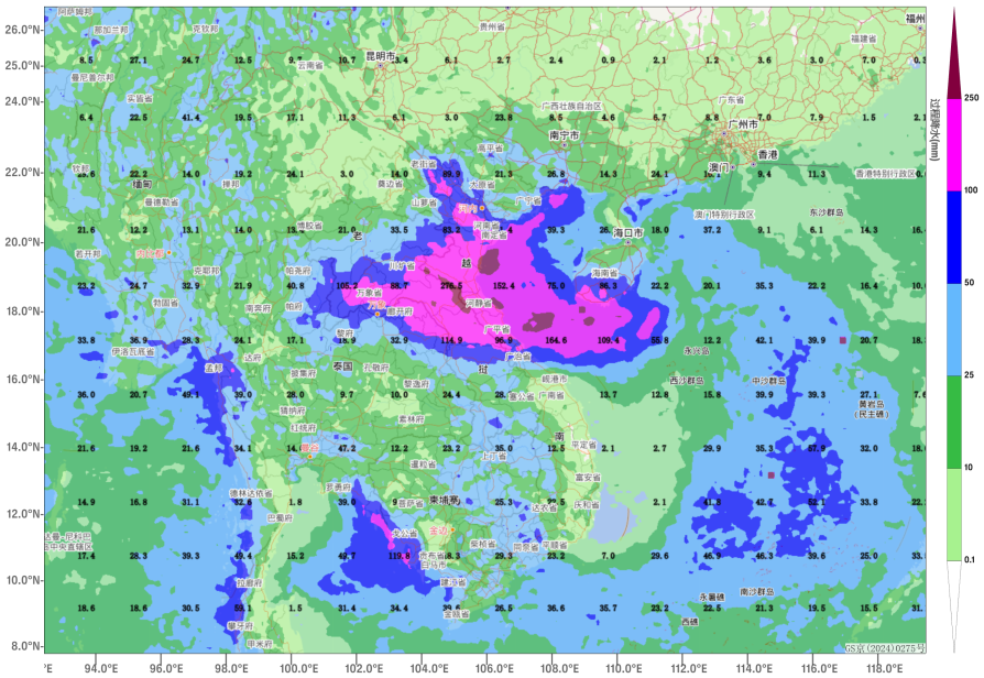 图2 2025年8月24–25日越南等地累计降水量预报(单位:mm)