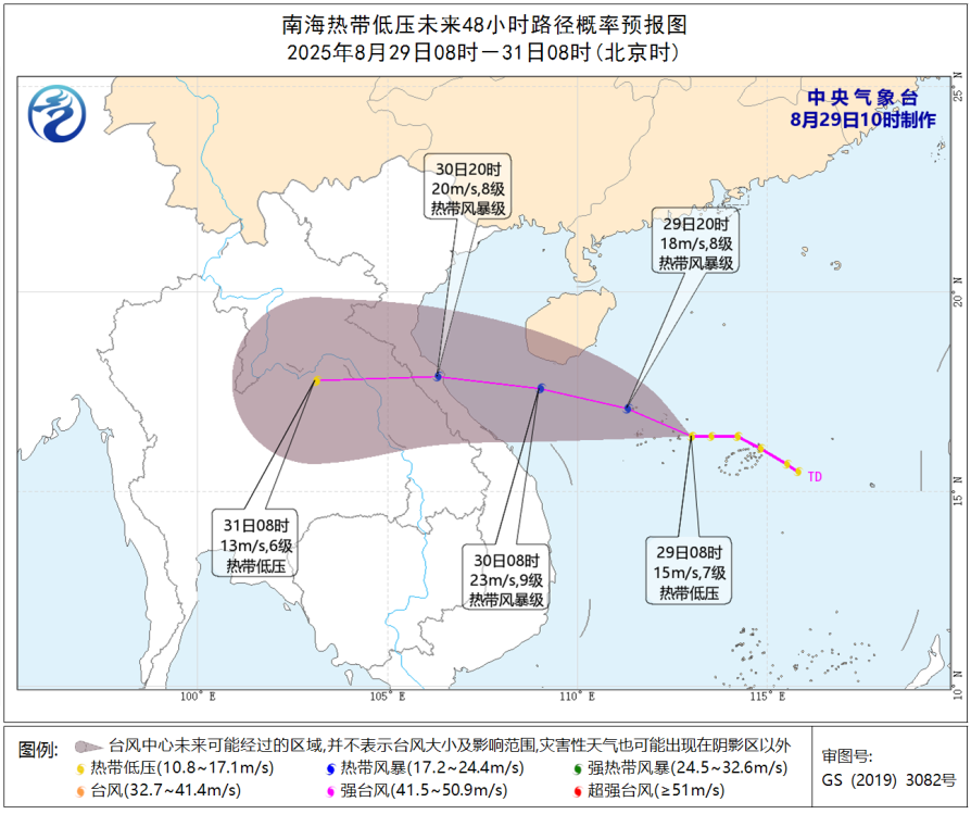 图1 热带低压路径概率预报图(北京时间2025年8月29日08时–31日08时)