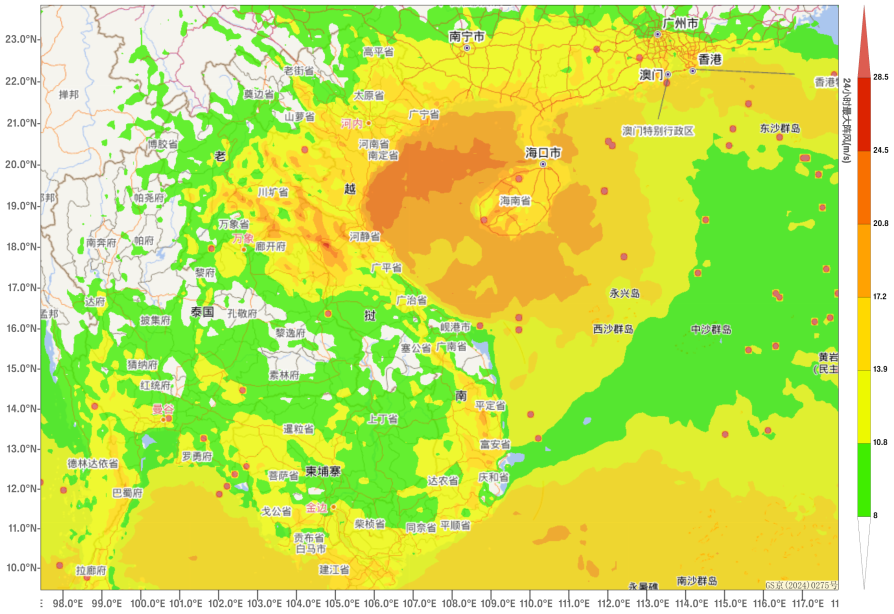受热带低压的影响(图1),预计8月29-31日,越南中北部将有中到大雨,其中,安沛省、富寿省、和平省、河西省、河南省、南定省、宁平省、清化省、义安省、河静省、广平省等地局地有暴雨或大暴雨;上述大部地区累计降水量50~90毫米,部分地区100~150毫米,越南中部局地超过260毫米(图2)。越南东部沿海将有7-8级大风,阵风可达9-10级(图3)。另外,老挝中南部、泰国北部、缅甸南部等地也将有大到暴雨,局地有大暴雨。