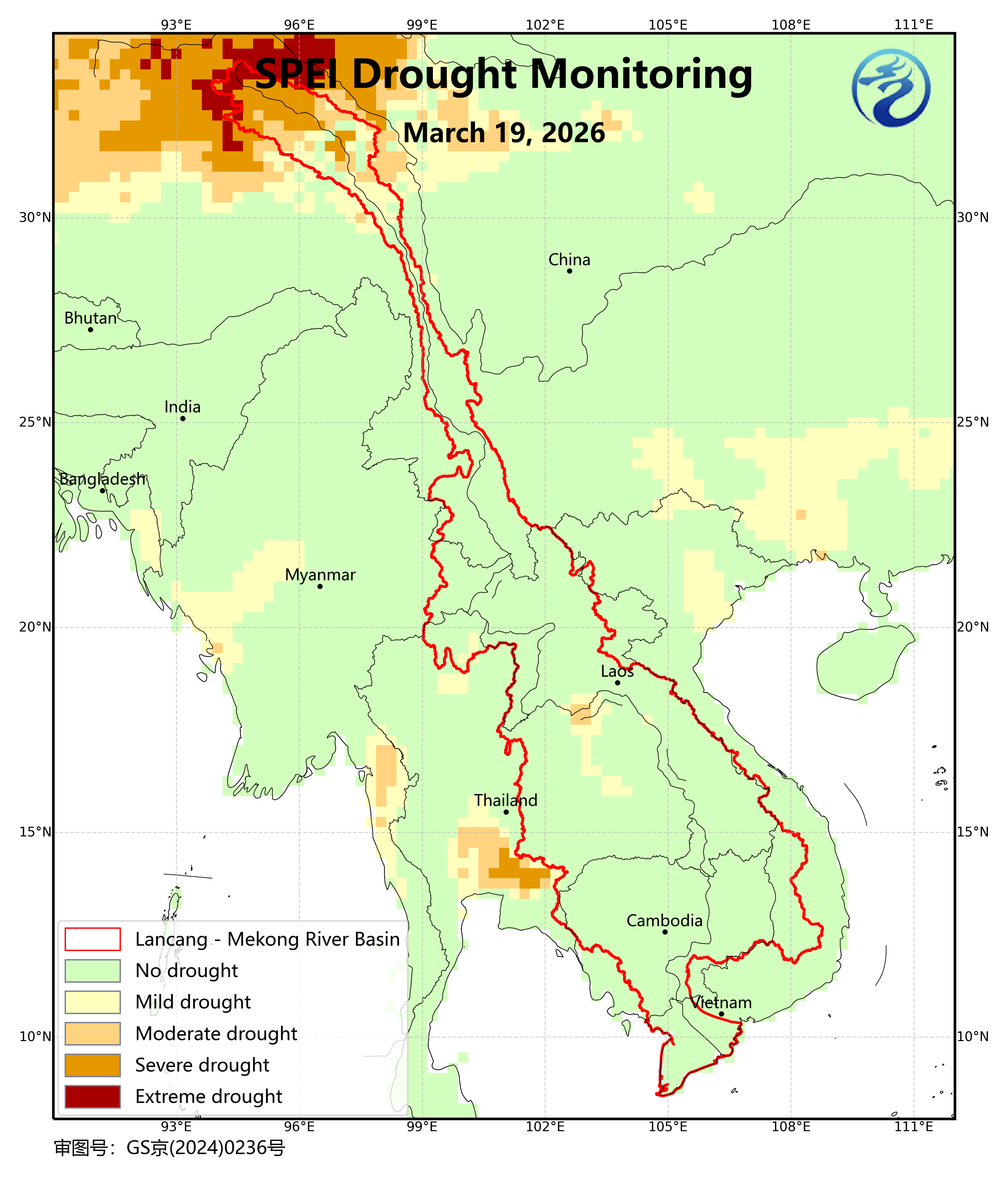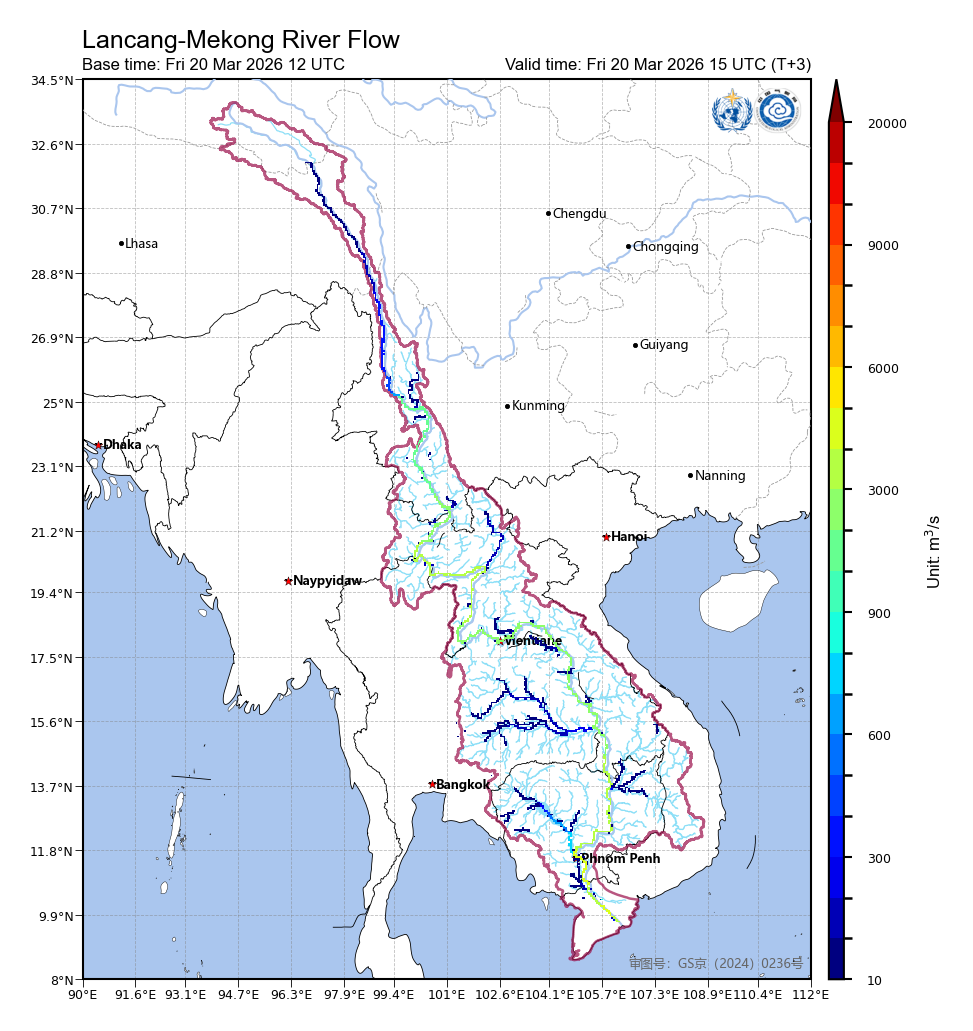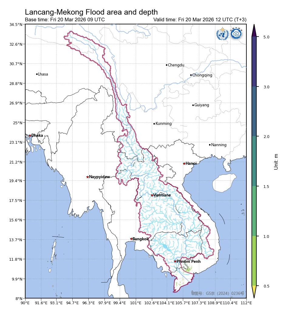 โดยอิงตาม แบบจำลองพลังงานอุทกวิทยา ที่สร้างขึ้นบนแพลตฟอร์มการแบ่งปันบริการอุตุนิยมวิทยาแบบบูรณาการของลุ่มน้ำล้านช้าง-แม่น้ำโขง โดยใช้ข้อมูลการสังเกตประวัติศาสตร์และข้อมูลการพยากรณ์กริดละเอียดทุก 3 ชั่วโมงสำหรับ 10 วันข้างหน้า ได้รับการพยากรณ์พื้นที่น้ำท่วมและความลึกของน้ำท่วมความละเอียด 500 เมตรสำหรับ 10 วันข้างหน้า ช่วงเวลากลับมาของน้ำท่วมและปริมาณฝนวิกฤตกำหนดความเสี่ยงน้ำท่วมสำหรับ 10 วันข้างหน้า