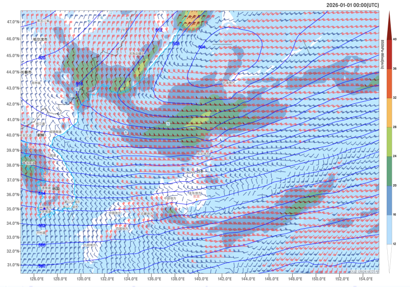 Figure 1 Forecast of 500 hPa Geopotential Height (Unit: dagpm) and 850 hPa Wind Field at 00:00 (UTC) on January 1, 2026 (Unit: m/s)