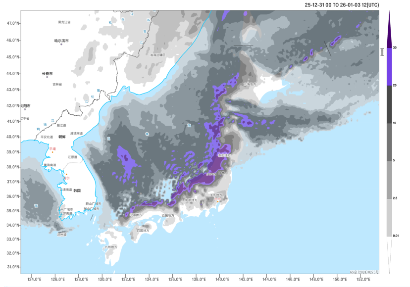 Affected by an upper-level cold vortex system (Figure 1), it is expected that from December 31 to January 3, 2026, most regions of Japan will experience moderate to heavy snowfall. Specifically, parts of Hokkaido, Tohoku, Chubu, Kinki, and the eastern areas of Chugoku will see severe to extreme blizzard conditions, with localized areas experiencing extraordinary heavy snowfall. The cumulative snowfall during this period is anticipated to be between 10 and 30 millimeters, with localized areas reaching 50 to 80 millimeters (Figure 2). The 24-hour new snow accumulation depth is expected to range from 6 to 12 centimeters, with some areas exceeding 20 centimeters. Additionally, strong winds of 6 to 7 on the Beaufort scale are forecasted, with gusts reaching 8 to 9 (Figure 3).