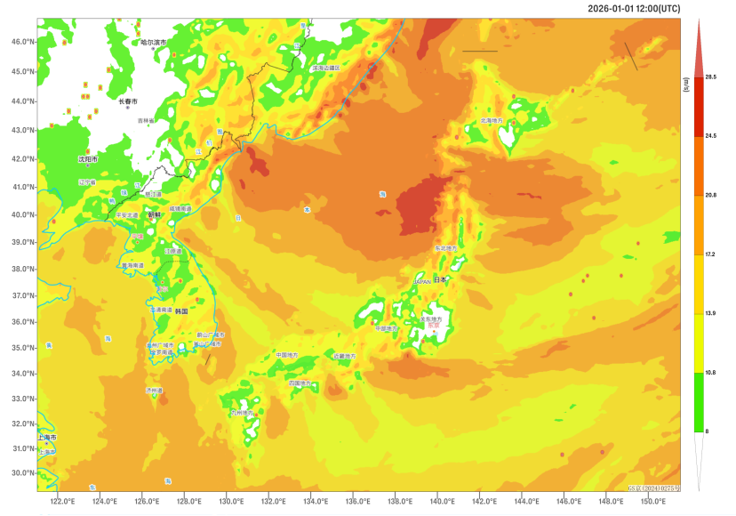 Figure 3 Maximum Gust Speed (Unit: m/s) for 24 Hours as of 12:00 (UTC) on January 1, 2026