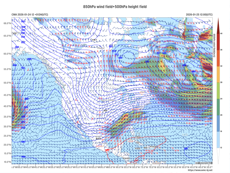 Figure 1. Forecast of 500 hPa Geopotential Height (units: dagpm) and 850 hPa Wind Field (units: m/s) at 12:00 (UTC) on January 25, 2026