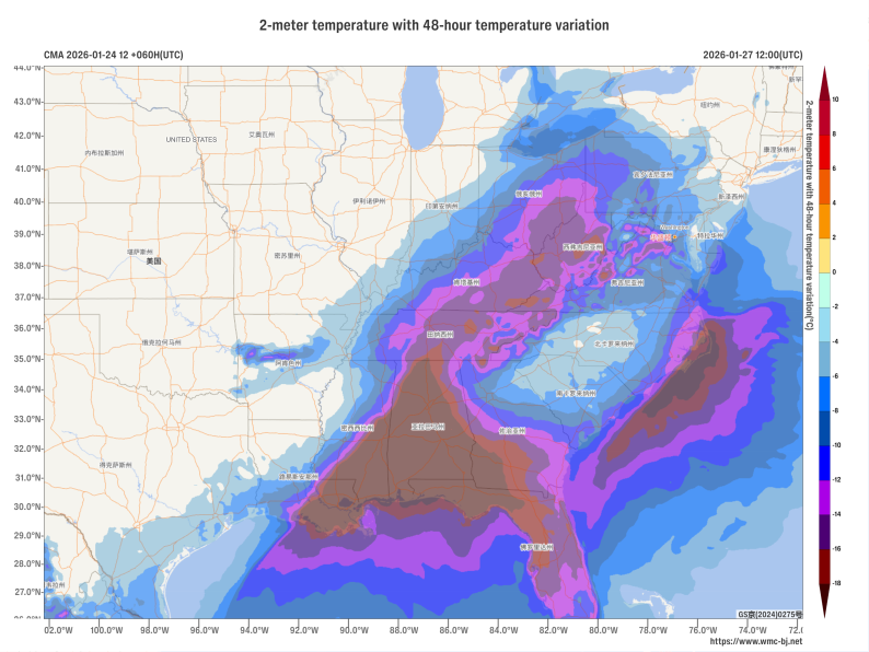 Figure 2. Forecast of Accumulated Temperature Drop from 12:00 on January 25 to 12:00 on January 27, 2026 (UTC)(Shaded areas indicate temperature drops of 4°C or more, Unit: °C)