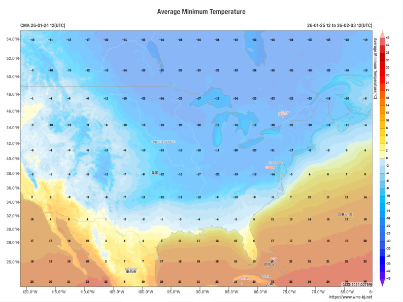 Figure 3. Forecast of Average Minimum Temperature from 12:00 on January 25 to 12:00 on February 3, 2026 (UTC) (Shaded, Unit: °C)