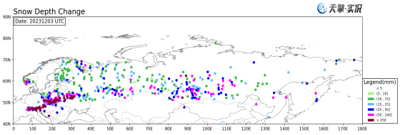 Figure 1. Depth of snow increase in Europe on December 3 (UTC)