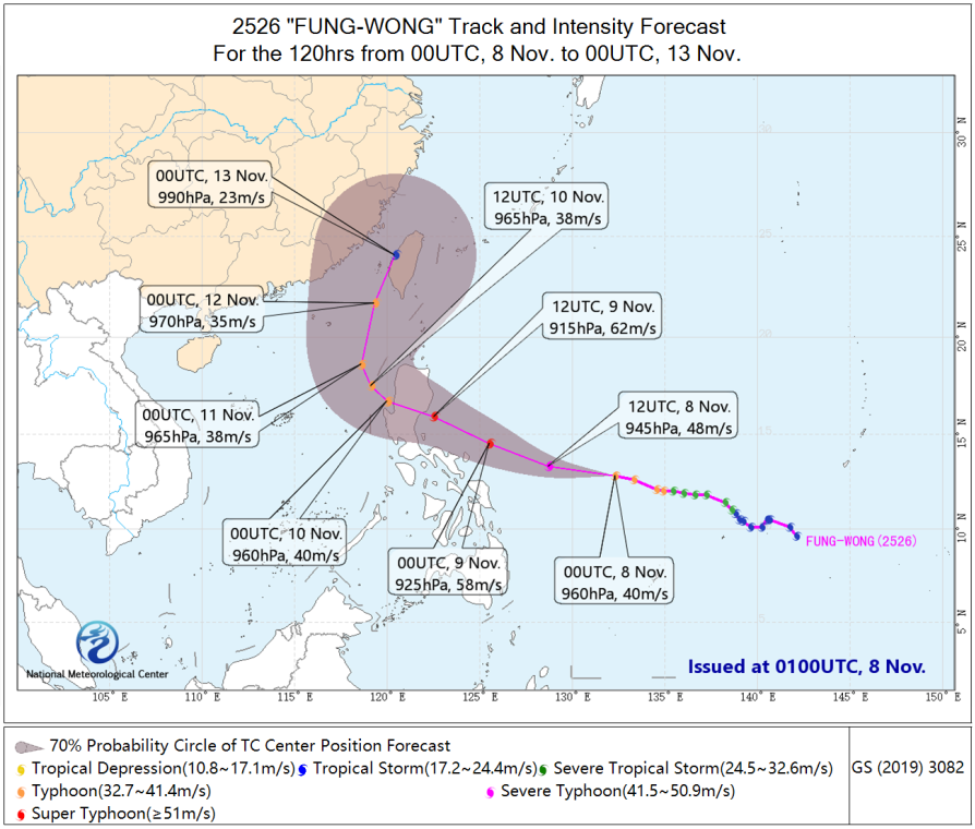 Typhoon Fung-wong, the 26th typhoon of this year, was located at 08:00 AM (Beijing time) today (the 8th) approximately 1240 kilometers east of Manila, the Philippines, over the northwestern Pacific Ocean, at 12.8 degrees north latitude and 132.3 degrees east longitude. The maximum wind speed near its center was 13 levels (40 meters per second), with a minimum central pressure of 960 hPa. It is expected that Fung-wong will move rapidly westward at a speed of 30-35 kilometers per hour, rapidly intensifying and potentially reaching super typhoon strength (55-65 meters per second, above 16-17 levels). The typhoon will gradually approach the eastern coast of Luzon, the Philippines, and weaken after crossing the island. It is forecasted to move into the South China Sea between noon and night on the 10th, subsequently turning gradually towards the northward direction (Figure 1).