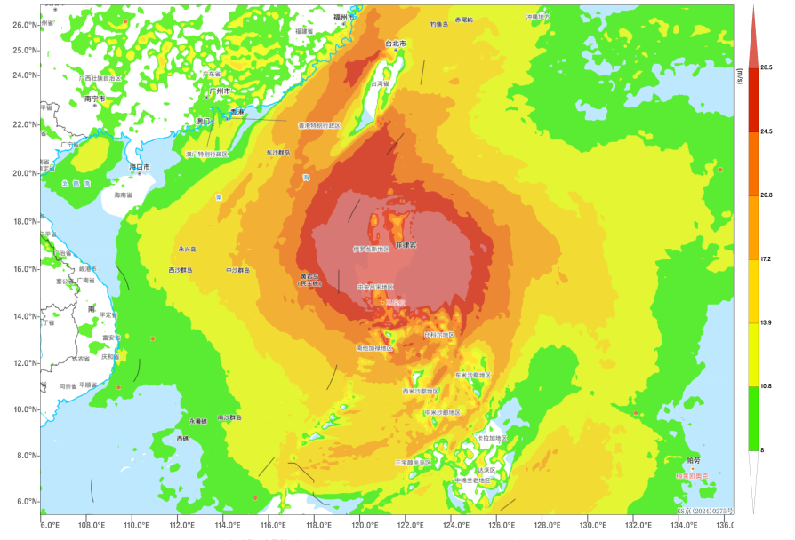 Figure 2: Maximum Gust Wind Speed (in m/s) for a 6-hour Period at 23:00 (Beijing Time) on November 9