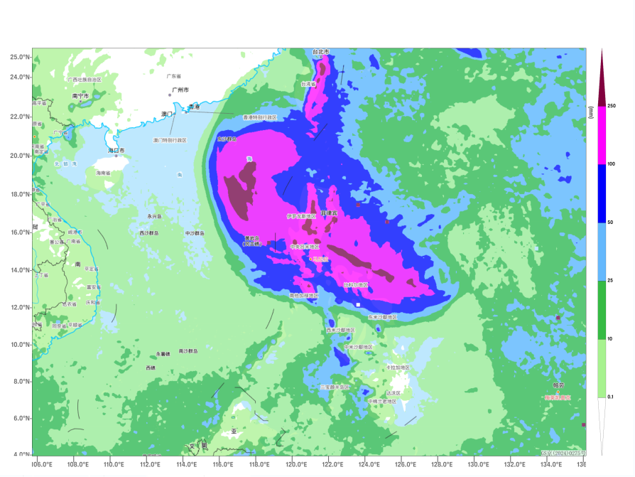 Affected by Typhoon "Fung-wong", from the 8th to the 11th, the majority of the Philippines will experience severe rain and wind conditions. Central and northern regions of the Philippines are expected to face torrential or extremely heavy rain, with some areas experiencing extraordinary downpours, accompanied by strong winds of 8 to 9 on the Beaufort scale, with gusts exceeding 11 levels (Figure 2). Accumulated precipitation in most of these areas will range from 70 to 150 millimeters, with some regions receiving 150 to 250 millimeters, and locally exceeding 300 millimeters (Figure 3). The intense rain and wind are likely to disrupt power facilities, transportation, and cause the collapse of buildings. There is a high risk of secondary disasters such as flooding, landslides, and mudslides, necessitating advance precautions.