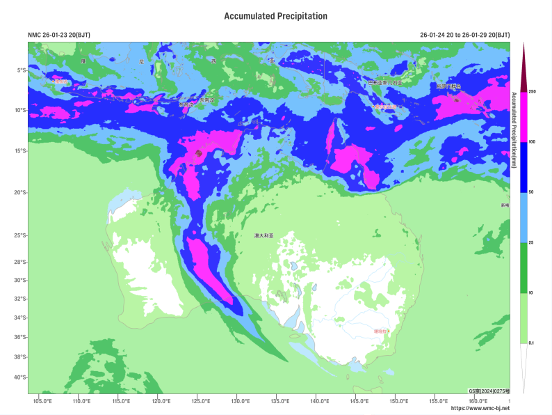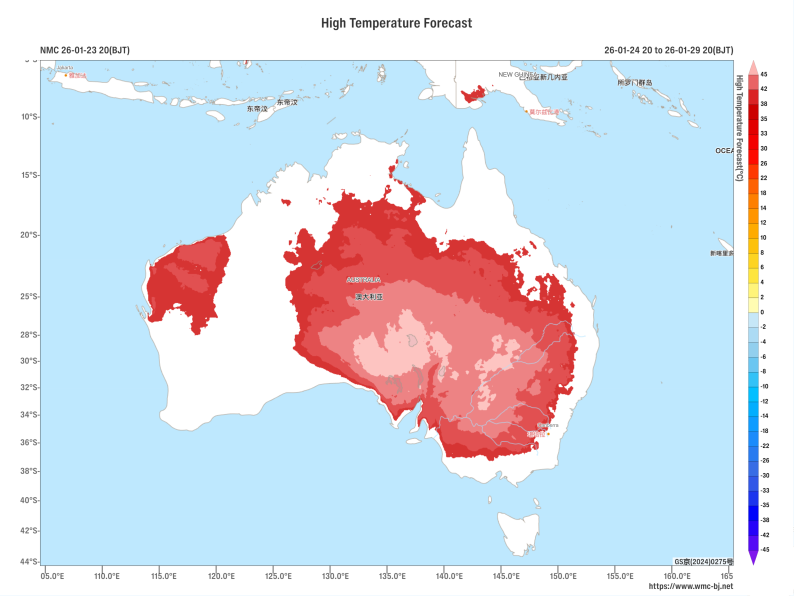 Additionally, the heavy rainfall has alleviated the extreme heat in western Australia. However, over the next five days, most of central and eastern Australia will continue to experience high temperatures ranging from 35 to 40°C, with localized areas expected to see maximum temperatures exceeding 42°C (Figure 4).