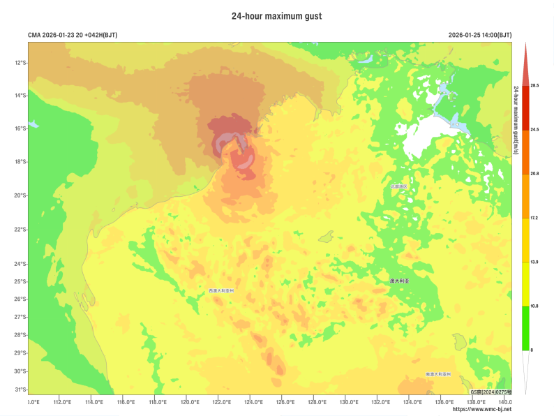 Figure 3. Maximum Gust Forecast from 14:00 on January 24 to 14:00 on January 25, 2026 (Beijing Time) (Shaded, Unit: m/s)