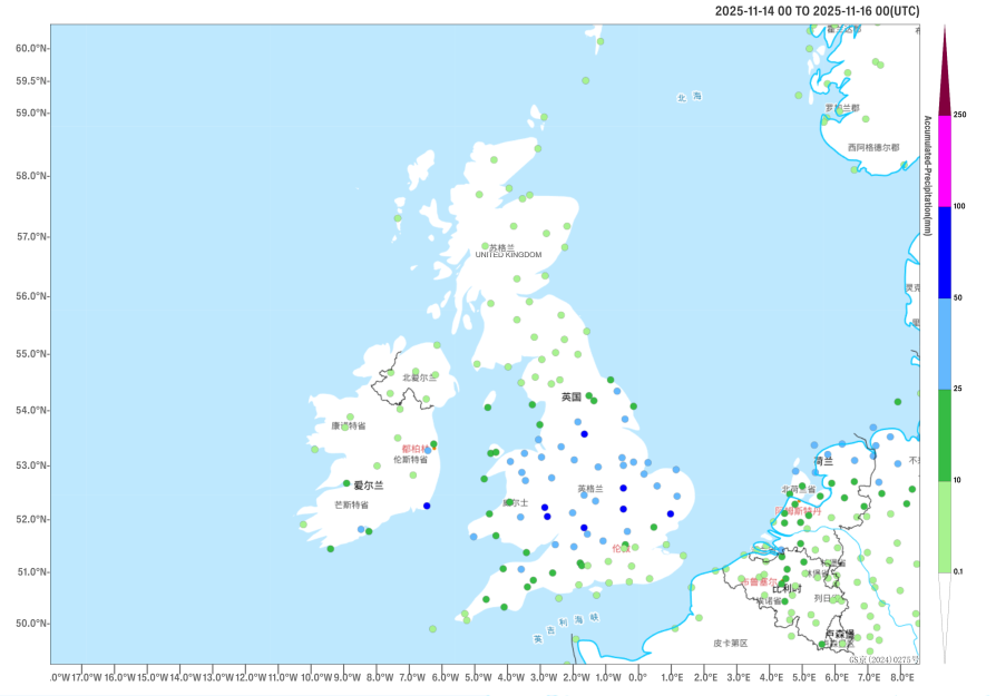 Affected by Storm Claudia, heavy to very heavy rainfall occurred in central and southern Britain on November 14-15, with localized downpours of 50-80 mm (Figure 1). Parts of England and Wales experienced flooding, with Monmouthshire being severely affected. Traffic was disrupted, and significant property damage was incurred. The West Midlands also suffered from flood impacts.