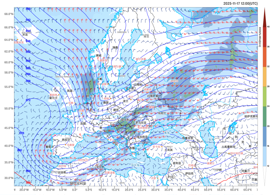 Figure 2: Forecast of 500 hPa Geopotential Height (units: dagpm) and 850 hPa Wind Field at 12:00 (UTC) on November 17