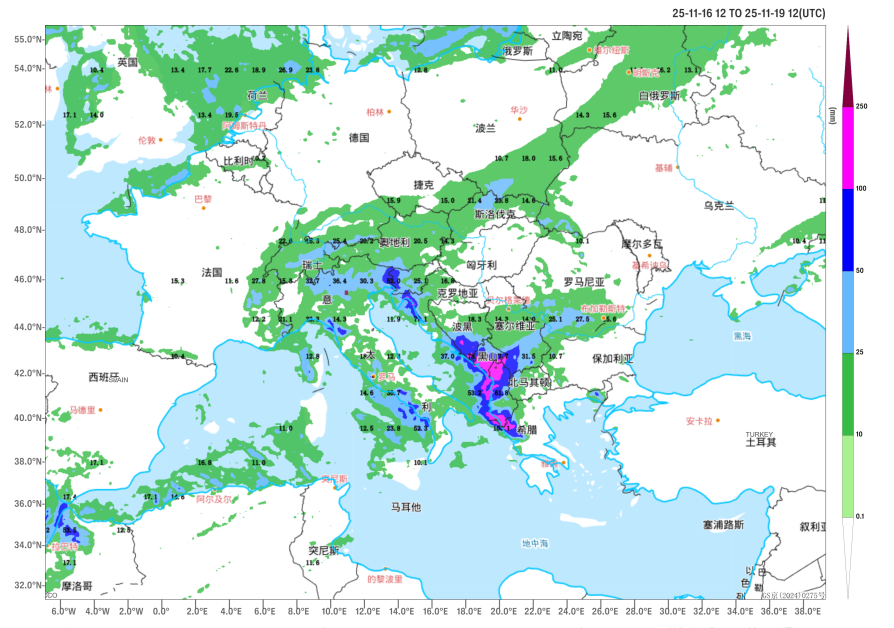 It is forecasted that from November 16 to 19, influenced by the upper-level trough and the remnants of Storm Claudia (Figure 2), parts of the Apennine Peninsula and southern Balkan Peninsula will experience accumulated rainfall of 30 to 50 millimeters. The eastern Adriatic coast is expected to receive 60 to 160 millimeters, with localized areas exceeding 200 millimeters (Figure 3). Specifically, central and southern Italy, Croatia, Bosnia and Herzegovina, Montenegro, and Albania will see heavy to intense rain, with some areas in Montenegro and Albania experiencing very heavy downpours.nnAdditionally, from November 20 to 23, due to the combined effects of cold air and warm, moist airflows, the aforementioned regions will continue to experience significant precipitation. Most areas will encounter heavy rain, while some regions will face torrential or very heavy rain.