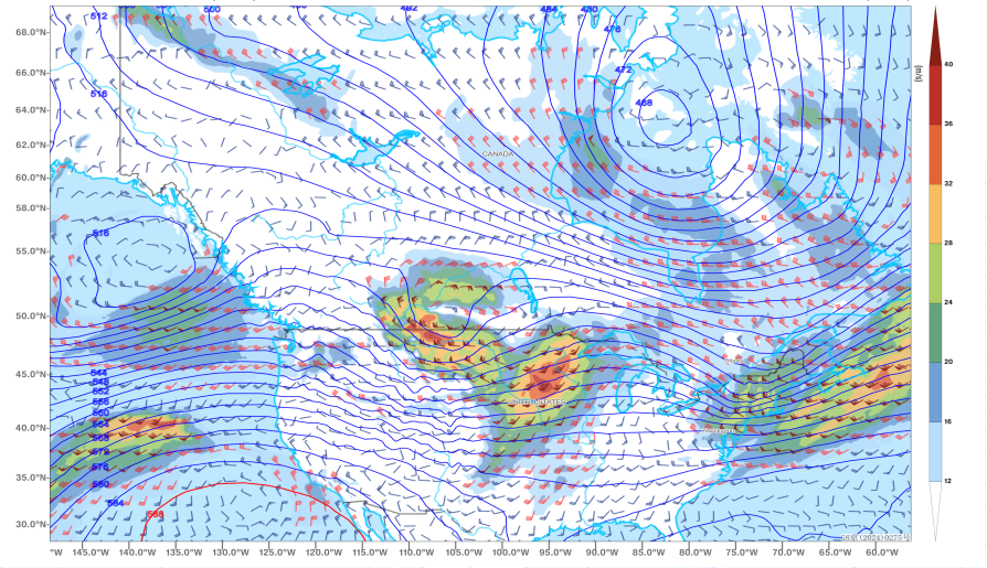 Figure 1 Forecast of 500 hPa Geopotential Height (Units: dagpm) and 850 hPa Wind Field(Unit: m/s) at 08:00 (BJT) on December 18