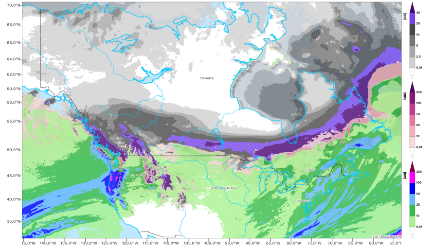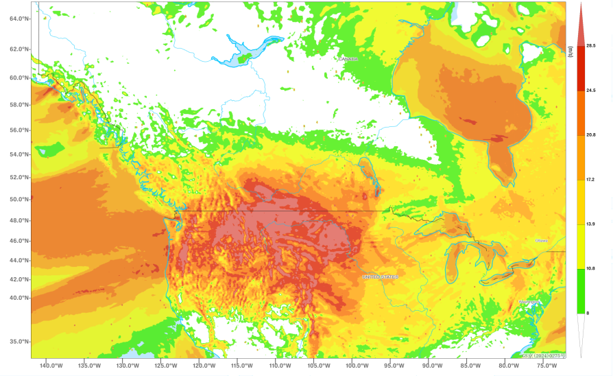 Affected by the eastward movement of an upper-level trough (Figure 1), it is expected that from the 17th to the 20th, parts of western and southern Canada, as well as northern United States, will experience a temperature drop of 8-12°C, with localized decreases exceeding 16°C (Figure 2). Most of these regions will see moderate to heavy snowfall, with localized severe to extreme snowstorms, accumulating snowfall of 10-30 mm, and in some areas, totals could exceed 40 mm (Figure 3). Coastal areas in the northwestern United States are expected to face heavy rain to torrential rain, with localized extreme downpours. Additionally, parts of Saskatchewan in Canada, and Washington, Idaho, Montana, and North Dakota in the United States will be accompanied by strong winds of 6 - 8 on the Beaufort scale, with gusts exceeding 10 levels (Figure 4).