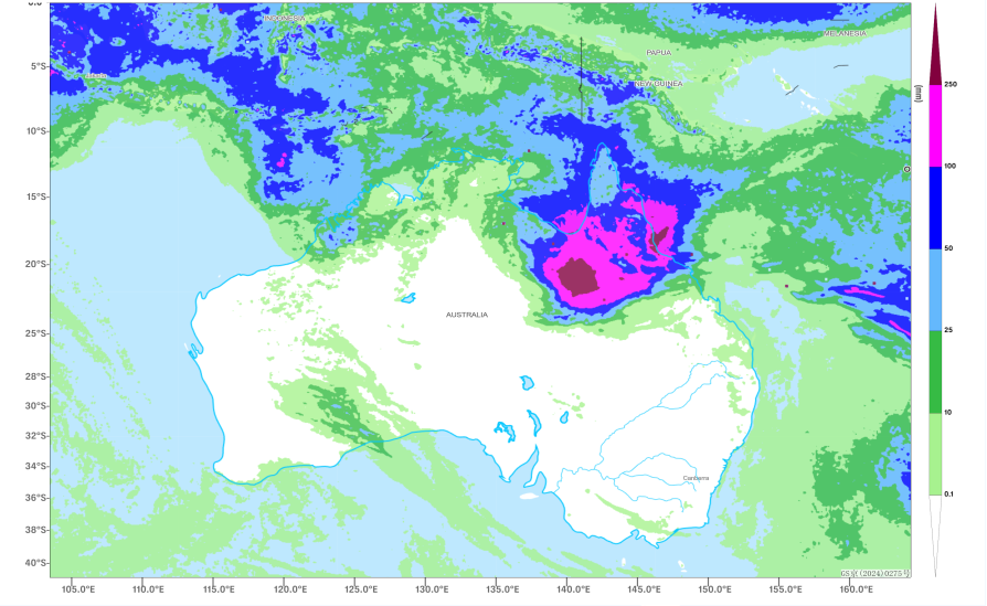 Affected by a tropical low-pressure system (Figure 1), it is expected that from the 27th to the 30th, parts of Papua New Guinea and northeastern Australia will experience moderate to heavy rainfall, with localized heavy downpours or intense rain. The cumulative rainfall is anticipated to be between 80 - 170 mm, with some areas potentially exceeding 220 mm (Figure 2).
