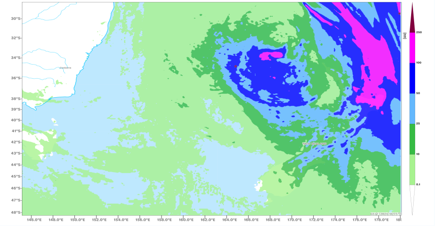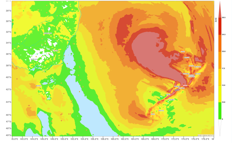 Additionally, from the 28th to the 30th, influenced by a low vortex, most regions of New Zealand's North Island and South Island will experience moderate to heavy rain, with some areas likely to see torrential or extreme downpours. The cumulative rainfall is expected to be between 60 - 90 mm, with localized areas potentially exceeding 150 mm (Figure 3). In these regions, strong winds of 6 to 8 levels will also be present, with gusts reaching 9 to 10 levels (Figure 4).
