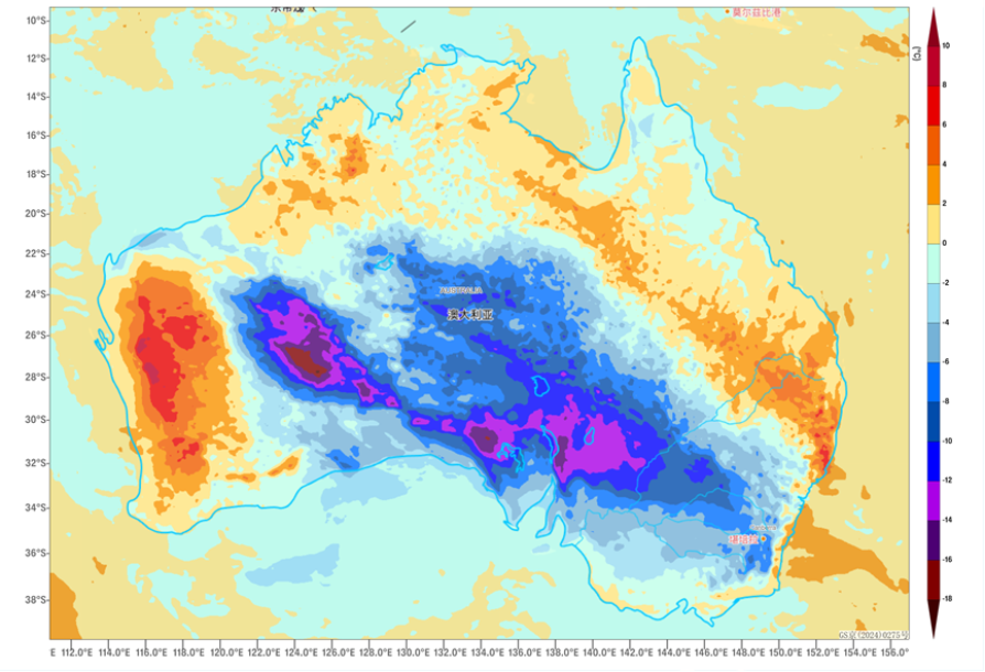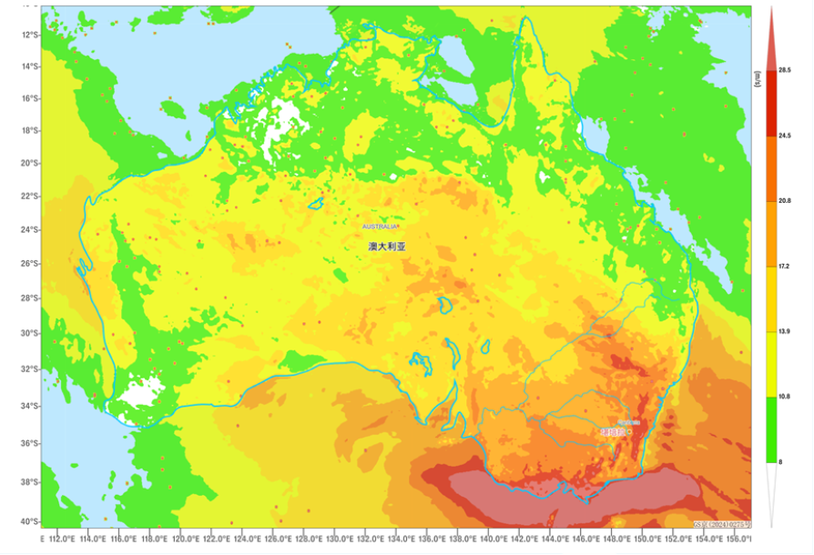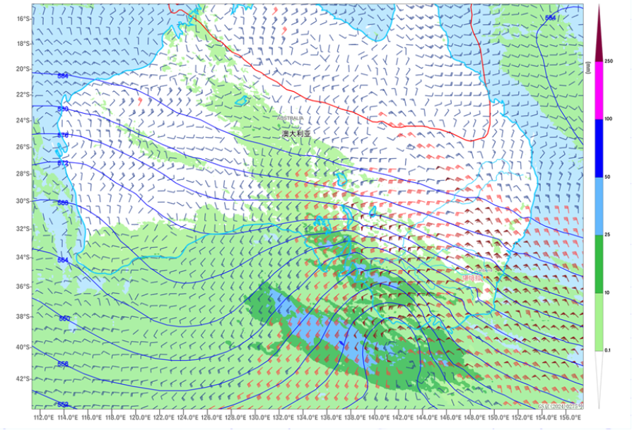 From October 21 to 23, influenced by the eastward movement of an upper-level trough, a weather pattern characterized by strong winds, cooling, and rainfall will develop from west to east across central and southern Australia. Some areas will experience a temperature drop of 8 to 12°C, with localized exceeding 14°C (Figure 1). This will be accompanied by winds of 5 to 6 on the Beaufort scale, with gusts reaching 7 to 8, and locally as high as 9 to 10 (Figure 2). The southern and southeastern coastal regions of Australia will see light to moderate rain, with localized heavy downpours (Figure 3). Precautions are advised against the adverse impacts of these strong winds, cooling, and rainfall on local power transmission and maritime transportation.