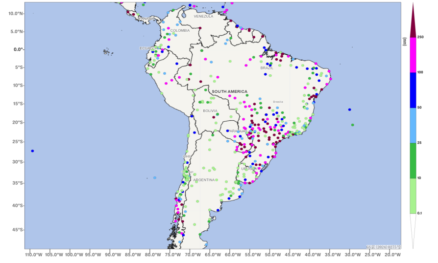 Over the past week, heavy rainfall has been observed in northern and western Venezuela, Colombia, Ecuador, Guyana, central Bolivia, eastern and southern Brazil, southern Paraguay, and southern Chile. Accumulated precipitation totals have reached 100-250 mm, with some areas exceeding 300 mm. Notably, localized rainfall in the Brazilian states of Mato Grosso do Sul, Sao Paulo, Paraná, Rio Grande do Sul, Bahia, and the Demerara-Mahaica region of Guyana has surpassed 500 mm (Figure 1).