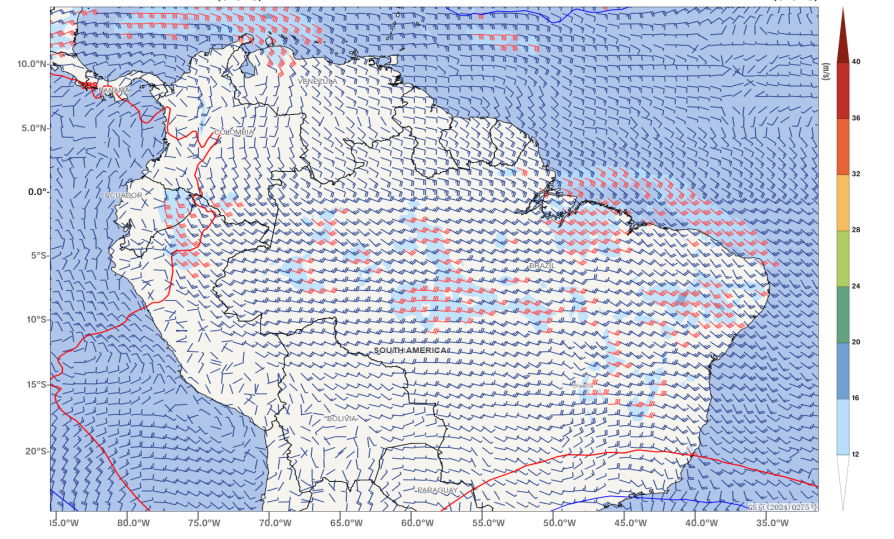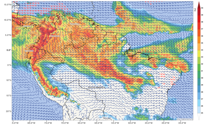 Over the next six days, influenced by the Intertropical Convergence Zone (Figure 2), parts of western Venezuela, southern and coastal western Colombia, eastern Ecuador, northwestern Brazil, and northwestern Peru are expected to experience moderate to heavy rainfall, with localized downpours. Accumulated precipitation is forecasted to range from 60-160 mm, with some areas exceeding 250 mm (Figure 3). These regions will also be accompanied by severe convective weather, including short-duration intense rain and thunderstorms with strong winds (Figure 4). Attention should be given to the risks of secondary disasters such as flooding, landslides, mudslides, and urban waterlogging in these heavy rainfall areas.