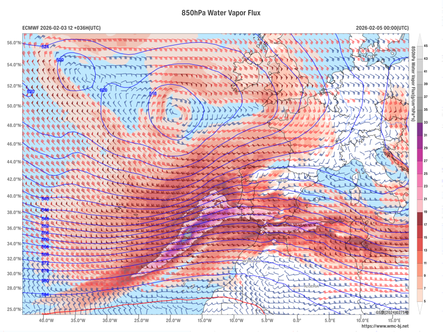 Figure 1 500 hPa Geopotential Height (units: dagpm), 850 hPa Wind Field Forecast (units: m/s), and 850 hPa Water Vapor Flux (units: g/(cm·hPa·s)) at 00:00 UTC on February 5, 2026