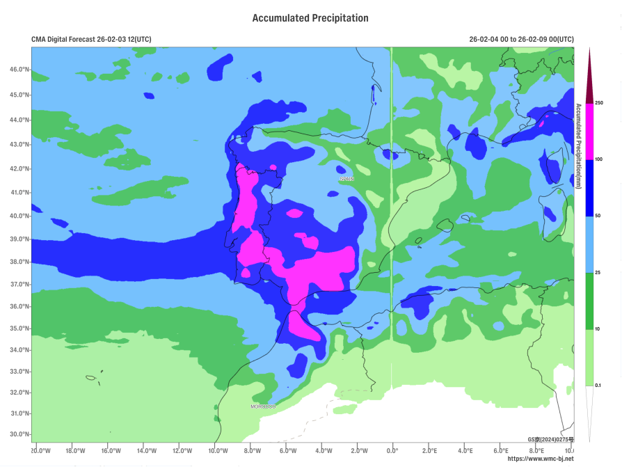 Over the next five days, influenced by an "atmospheric river" originating from the Caribbean Sea (Figure 1), parts of Portugal, central and southern Spain, northern Morocco, and northern Algeria will experience heavy to intense rainfall. Specifically, regions such as Andalusia in Spain and the northwest of Morocco are expected to see torrential downpours, with cumulative rainfall totals ranging from 60-90 millimeters, and some areas may reach 120-160 millimeters, with localized totals exceeding 250 millimeters (Figure 2). These regions will also be accompanied by strong winds of 6-8 levels, with gusts reaching 10-11 levels in coastal areas (Figure 3). This episode of heavy rainfall and strong winds is of an extreme nature and may surpass historical records for the same period. Attention should be given to potential secondary disasters such as flash floods and urban flooding, as well as adverse impacts on agriculture, transportation, and other industries.